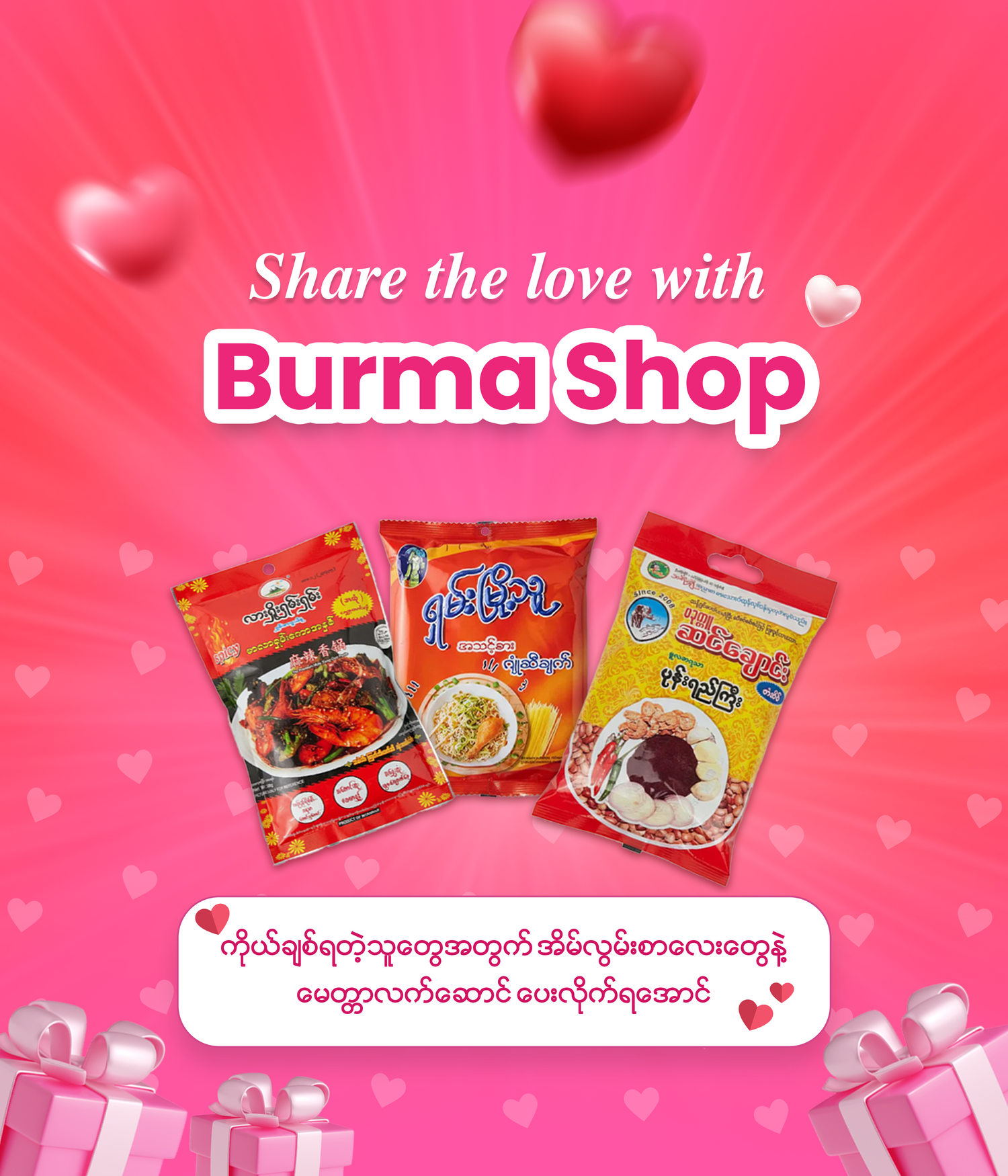 ချစ်ခြင်းမေတ္တာဆိုတာ ချစ်သူအချင်းချင်းတင်မကဘဲ ကိုယ်အလေးထားရတဲ့ မိဘ၊ ညီအစ်ကိုမောင်နှမနဲ့ သူငယ်ချင်းတွေအပေါ်မှာလည်း ရှိနေတတ်ပါတယ်။ ဒီဖေဖော်ဝါရီမှာ အဝေးတစ်နေရာစီ ရောက်နေကြပေမဲ့ ကိုယ့်ရဲ့ ဂရုစိုက်မှုကို ပြသဖို့ အကောင်းဆုံးနည်းလမ်းကတော့ ချစ်ရသူတွေ အနှစ်သက်ဆုံး မြန်မာ့ရိုးရာအစားအစာလေးတွေကို လက်ဆောင်ပါဆယ် ပို့ပေးလိုက်တာပါပဲ။ နွေးထွေးတဲ့ မေတ္တာတွေနဲ့အတူ Burma Shop ရဲ့ အကောင်းဆုံး အိမ်လွမ်းစာလေးတွေကတစ်ဆင့် သင့်ရဲ့ အချစ်တွေကို ဝေမျှလိုက်ပါနော်။ ဒီချစ်သူများနေ့မှာ လူကြီးမင်းတို့နဲ့အတူ ချစ်ရတဲ့ မိသားစု၊ မိတ်ဆွေသူငယ်ချင်းများအားလုံး အေးချမ်းသာယာတဲ့ နေ့ရက်လေးကို ပိုင်ဆိုင်နိုင်ကြပါစေလို့ ဆုတောင်းပေးလိုက်ပါတယ်။